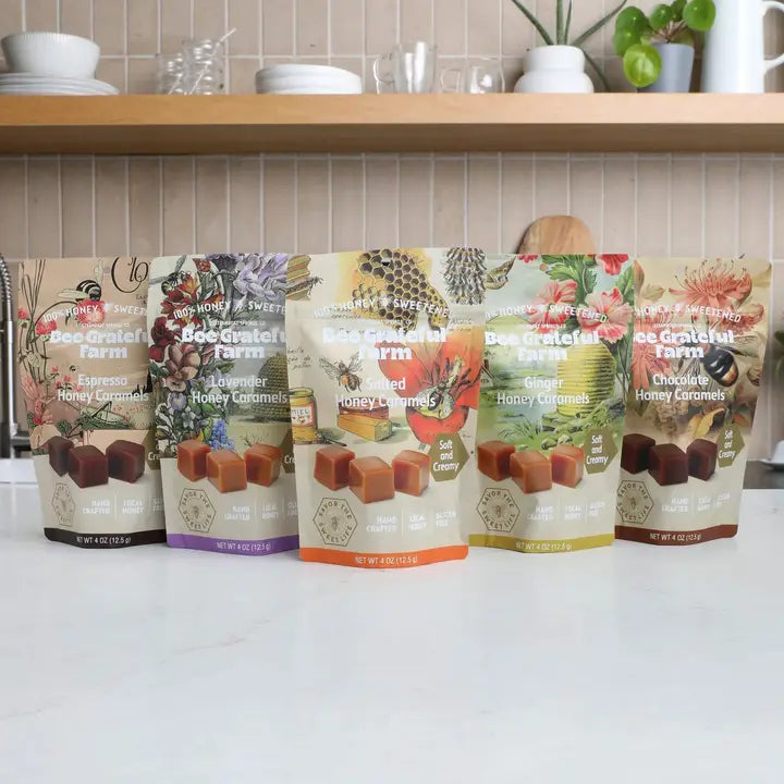 Indulge in the Bee Grateful Ginger Caramel, crafted with local wildflower and alfalfa honey for a rich, natural sweetness. This extra creamy caramel is expertly blended with organic cream, butter, and sunflower lecithin, then infused with organic ginger root for a subtle, warming spice. Finished with pink salts harvested from an ancient Utah ocean, each bite offers a balanced harmony of flavors and textures, showcasing the finest ingredients for a sophisticated treat.